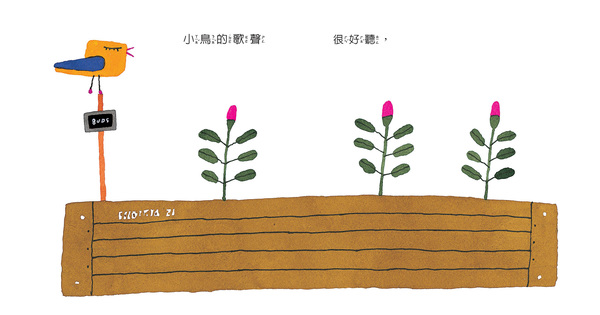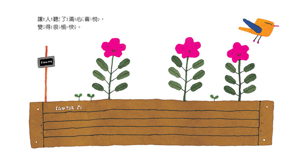 五味太郎一直是十分關照孩子心靈和想像的繪本畫家,他畫的一系列幼幼繪本中,總是希望讓孩子可以看見不一樣的世界。他提醒著孩子(還有心裡面仍保有童心的大人們),「有一隻小鳥的歌聲很好聽,讓人聽了滿心喜悅,變得很愉快;小鳥的歌聲非常清亮,就算是原本想做壞事,聽了就會打消念頭,小鳥的歌聲讓人產生勇氣、回憶起從前的事……」這隻神奇的小鳥就像是神奇的魔法,好像只要聽一聽牠的歌聲,種子就能發芽、花也綻放,就連無精打采的午後,也突然元氣十足,似乎所有的困難都可以迎刃而解。五味太郎的文字簡短,卻鏗鏘有力的提醒,而圖畫卻是讓我們觀察每一個登場人物的改變和情緒變化。