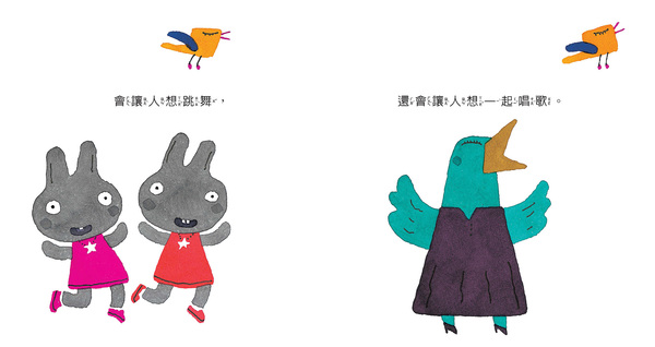每個人看完這本書,應該都希望身邊有這樣的小鳥吧?其實,這隻會唱出美妙歌聲的小鳥,可能是隨處可見的小麻雀或是野鴿子,也可能是路邊一朵小花、別人的一個微笑,或是美麗的陽光……等,牠提醒著我們去發現生活中許多的美好,多接觸美好的事物,也就能培養出善意的信念;接著,也能沉澱一下自己的心靈雜想,面對難以控制的情緒,也能心平氣和的接受。孩子常常無法控制自己的情緒和感受,有時候可能是因為生理的影響,甚至是心理上的安全感缺乏,不妨透過這本《小鳥請唱歌》,讓孩子觀察圖面上前後對照,讓孩子能夠觀察故事中的人物情緒變化,同理自己的感受,也能趁機告訴孩子,提醒他可以和小鳥一樣,帶給周圍的人更多的歡樂呢!