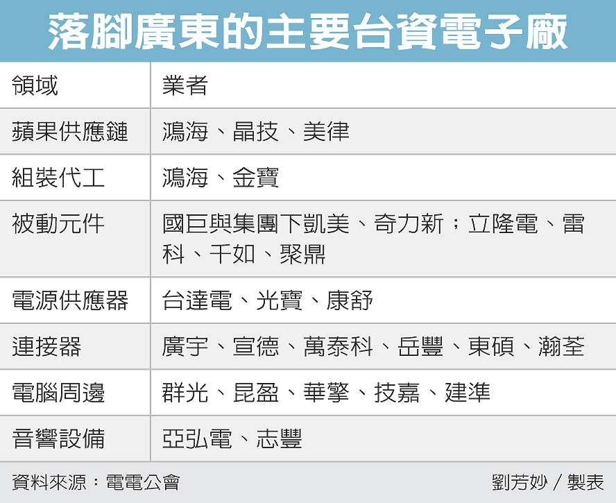 根據台灣區電機電子工業同業公會(電電公會)登錄資訊,台商共有951家落腳廣東,以鴻海、台達、光寶、國巨等四大集團規模相對大,牽涉的產業別涵蓋蘋果供應鏈、組裝代工、連接器、被動元件、電源供應器、電腦周邊、音響設備等七大領域。