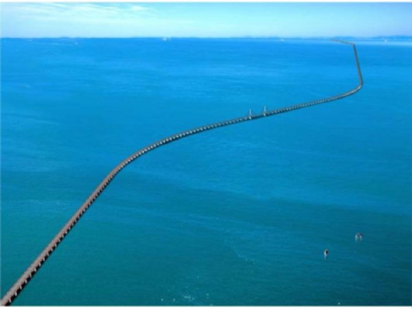 連接上海和「洋山深水港」的東海跨海大橋,全長32.5公里,是目前世界上最長、中間沒有島嶼依托的跨海大橋。大橋有一段特別昇高使大型船隻能穿越通行(見下圖)。
