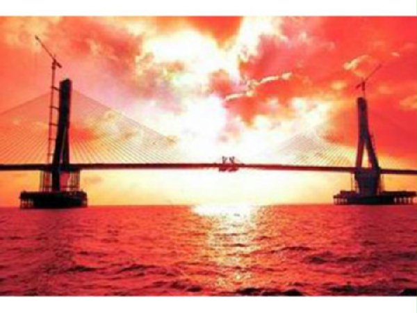 東海大橋橫臥在碧波之上,在霞光中展現迷人的風采。這座大橋代表古老的中國脫胎換骨後迎向朝霞,重新展現出年輕的生命力。