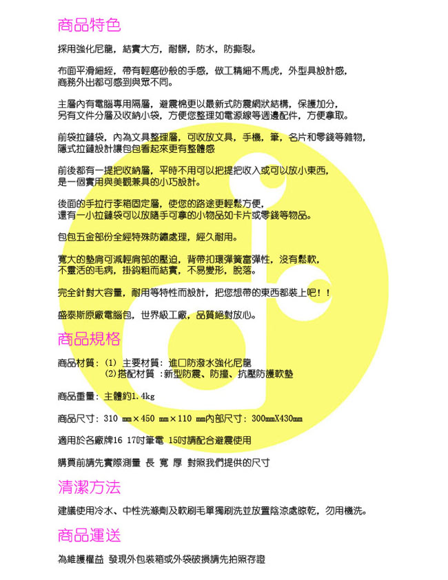 筆電專用避震隔層 良好庇護電腦大尺寸,東西多也不怕強化尼龍,耐磨 不易沾塵用料做工都細心,空間設計合理側背或手提可自由選擇