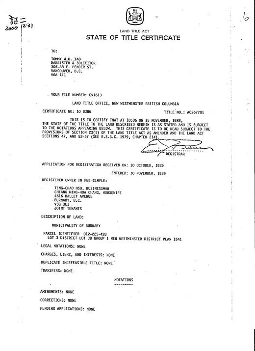 TENG-CHAO HSU(許登昭) was born on 30th August1956 immigrated to Vancouver on 18th December 1991. My immigration number is B023366943. Canadian Social insurance number 729111 039.My ID Number of The Republic of China is Q120439047.