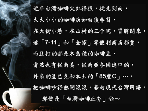 台灣的確是在咖啡的生產帶上,有栽植咖啡的條件,尤其是海拔八百到一千五百公尺的茶園栽種地,極適合咖啡生長,加以台灣向來以農改技術傲視全球,加上農民勤奮認真,也許有一天,台灣靠著改良技術,也能研改出口味獨到的咖啡品種。