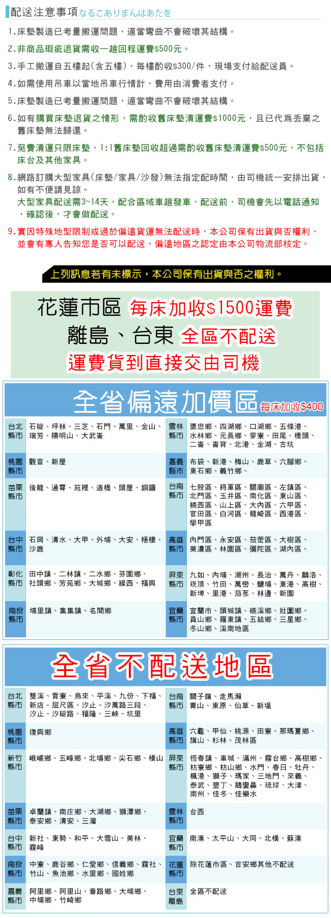 6.偏遠地區配送須7~20天須配合車趟發車,送貨前司機會電聯配送