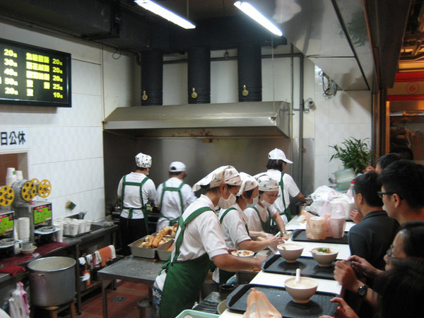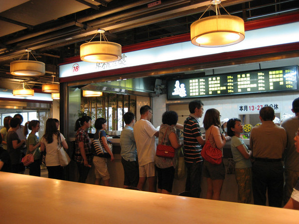 客人雖多,現場則井然有序,大家規規矩矩地由「阜杭豆漿」販售櫃台依序排隊,外帶者付款取餐離去,內用者則以托盤端著早點覓座用餐;人龍由櫃台沿著美食街邊緣往後排,其中有相當多手持觀光手冊的日本客人。這天,還遇到身穿牛仔褲的國際奧會吳經國委員偕同家人前來吃早點呢!