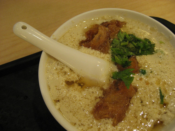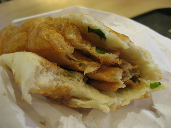厚餅和油條都是現場製作,厚燒餅紮實富咬勁,愈嚼愈香,尤其添加青蔥,鹹中帶有蔥的甘甜,連同香而微脆的油條,搭配散發濃郁的豆漿,果然不同凡響。糯米飯糰包了肉鬆、菜脯丁和油條,油條並未炸老,是以吃起來軟軟的,口感讓人有些失望。至於鹹豆漿,除了油條、香菜,店家還特地加了小蝦皮,吃起來有一股說不出的香味。