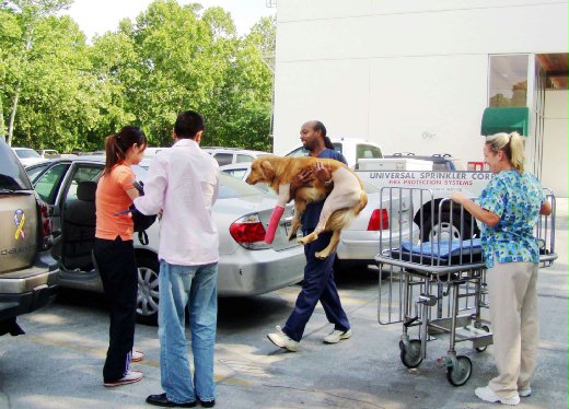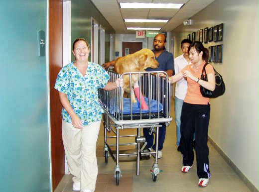 到了醫院,護士以手推車來停車場接嘟嘟。這是一個獨立的建築物,地上一層地下兩層,依地形而建。我們一群人陪嘟嘟等電梯,出來兩三條狗狗和牽著牠們的主人;到了樓下門一開,分門別類:外科、內科、腸胃科、神經科、皮膚科、腫瘤科、放射科、過敏科、復健科….各科診室一應俱全。儘管一切均已電腦化,護士櫃檯後方的病例室,三面牆密密麻麻放滿了寵物們的檔案,同一般醫院沒有兩樣。牆上還張貼了一張又一張家長和狗兒貓女們的全家福,後來看資料知道這家醫院有53,000平方英呎,常有專程來自外州的寵物在此就醫呢。