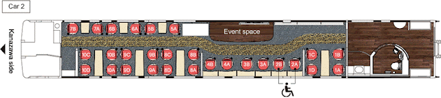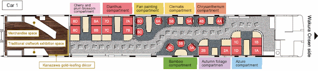 第一節車廂由木條分隔出8個私人空間的座位,走道上則舖著象徵日本花園踏脚石的圖案。