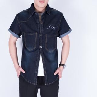 心想事成人人愛-美式休閒刷色短袖牛仔襯衫丹寧外套夾克男裝-深藍7701