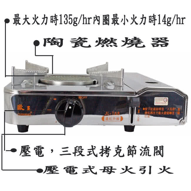 耗氣量:最大火力時135g/hr內圈最小火力時14g/hr