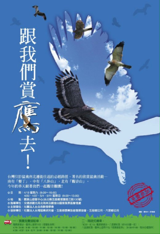 時間是從四月十九日(周末上午九時到下午四時)起,每個星期假日,包括四月二十日至五月十一日(上午九時到下午一時),在觀音山遊客活動中心(五股鄉凌雲路三段一百卅號)集合,跟著鳥朋友們一起賞鷹。
