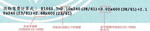 下圖的計算式因為是7月的帳單,7月是收5月和6月的電費,5月是非夏季、6月是夏季,電價不同,所以7月的帳單因為橫跨夏季和非夏季而比較複雜。