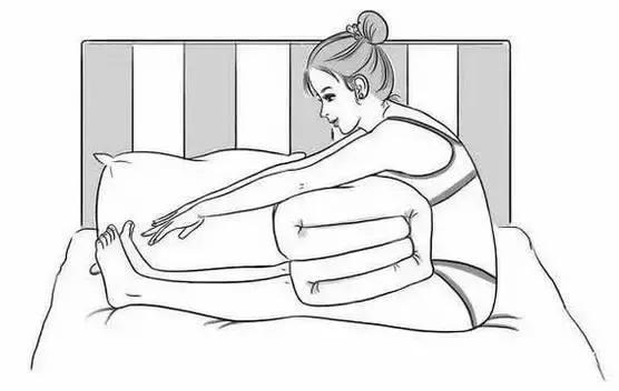 雙腿併攏伸直,您如果是在家裡練習,那就平坐在床上,腿上放一床被子,上半身向前趴在被子上,腳尖向回勾。如果覺得輕鬆,您就把被子放低點,這樣可以拉伸到膀胱經,緩解疲勞、消除精神緊張。