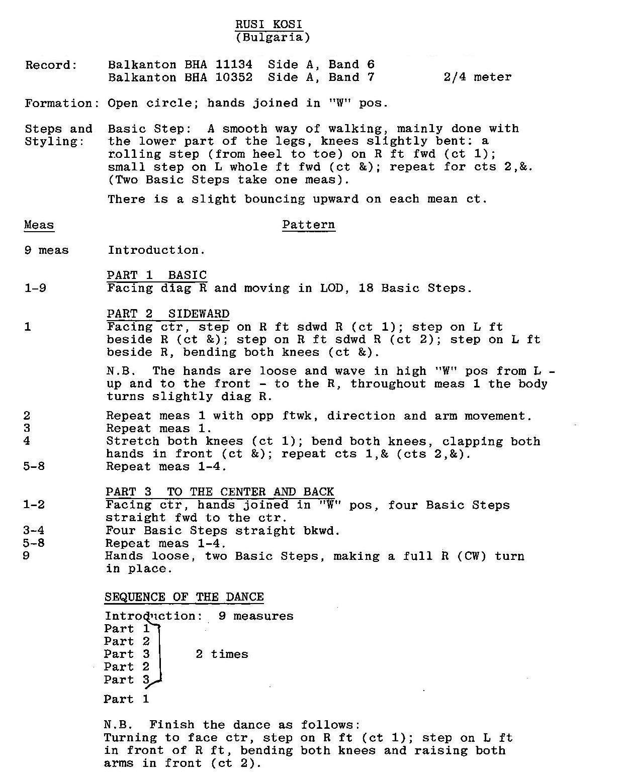 歌名: руси коси имам (音譯: Rusi Kosi Imam;中文意思:我有一頭的金髮), 作詞: 保加利亞民謠 作曲: 保加利亞民謠 演唱: 演唱者眾,土風舞版可能是保加利亞皮林省合唱團演唱的版本 舞名: 同歌名 編舞: 待考 中文舞名: 露絲高斯