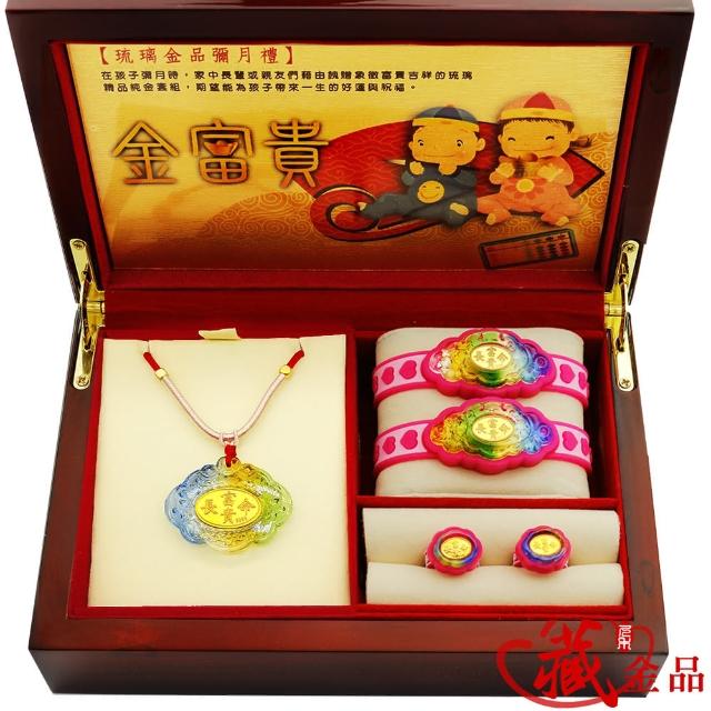 【A+】長命富貴圓滿鎖-999千足黃金琉璃彌月禮--藏金品系列(項鍊手鍊戒指5件組)穿搭達人