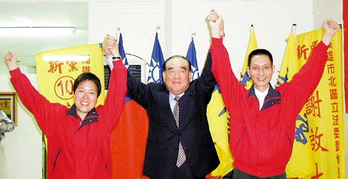 前檢察官高新武(右)因罹患食道癌昨天下午過世,得年六十一歲;九年前他代表新黨在高雄市參選,郝柏村(中)曾為他站台輔選,左為前立委謝啟大。(聯合報資料照片)