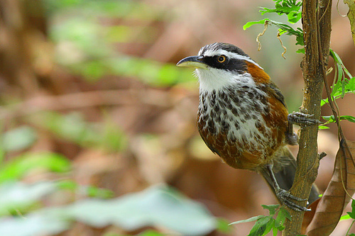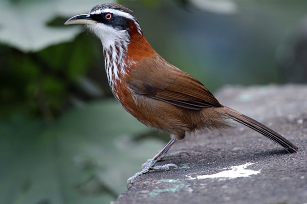 .腮喉白色,胸白色有黑褐色縱斑,腹紅棕色,混合有白斑。