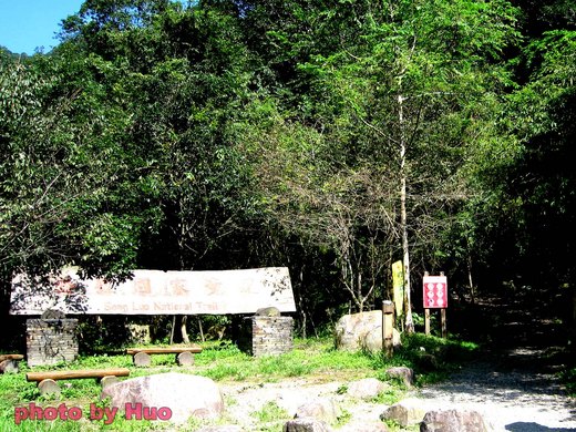 沿著溪邊新鋪的水泥道路,繞過一大片蔥田,經過自來水廠,見到松羅國家步道標誌,整個步道的生命才開始鮮活起來(圖2),水冬瓜、水同木、苧麻、毬蘭、抽葉藤、石藻等濕生植物處處可見。
