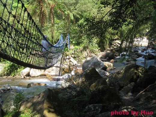 愈往內走,山蘇等附生植樹就生長得更茂盛,長滿整個樹幹,形成特殊的自然景觀。走過橫跨河床的繩梯(圖3),沿著湍急的溪水左側走,大約會與三條分支步道相會合,往下方靠著溪河走,會經過巨石的缝隙。