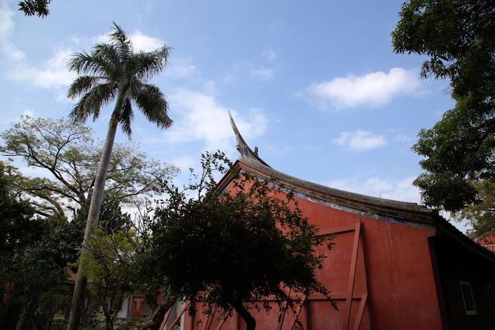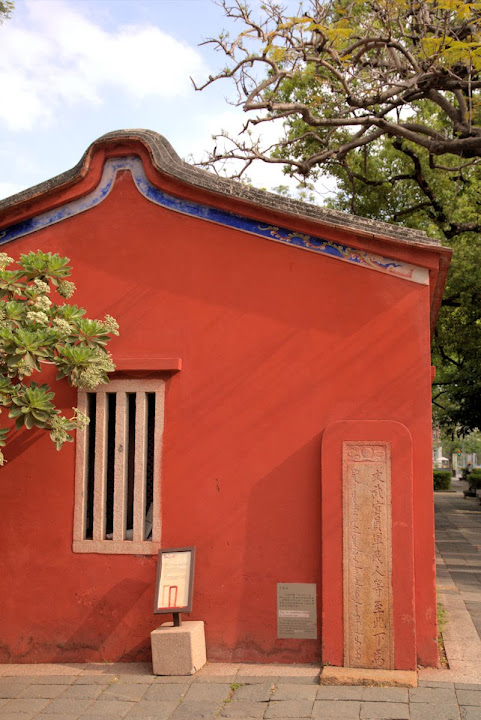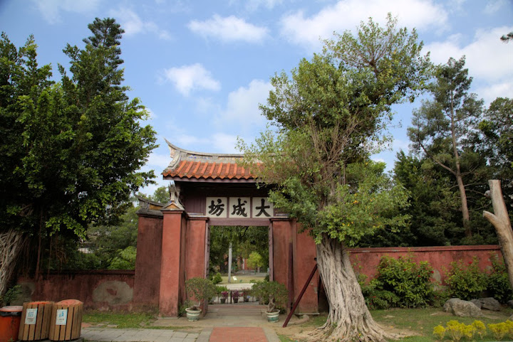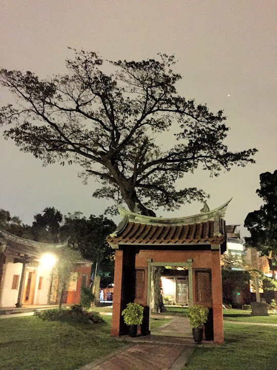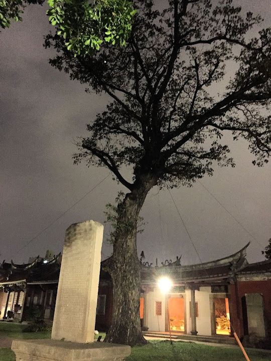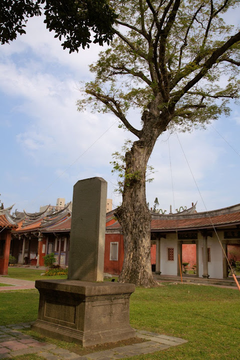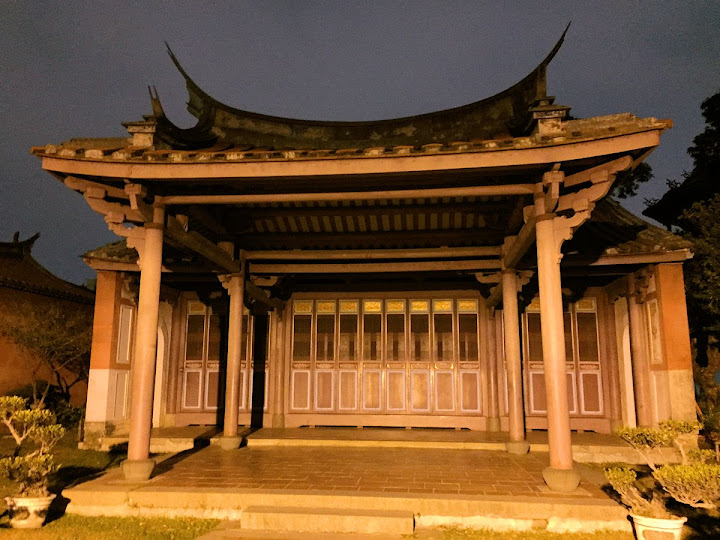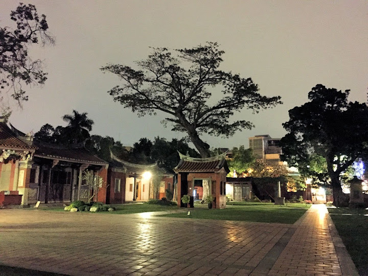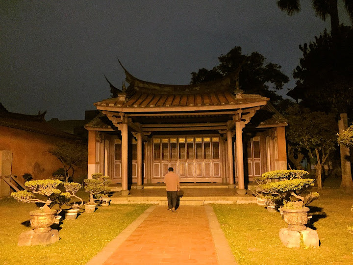 孔廟於1665年(明永曆十九年,清康熙四年),由陳永華提議興建。初時僅有大成殿,用以祭祠孔子,後來再設明倫堂供講學,是為全臺首學。歷明、清、日本、民國時期,各代均有翻修,於1983年列為一級古蹟。1997年文建會委託成大建築系規畫以孔廟為中心的文化園區,包含孔廟周圍若干史蹟景點。這日剛好在附近打尖,入住前摸黑夜遊,天亮後再連同旁邊忠義國小繞上一圈,因此有晝夜不同景致。