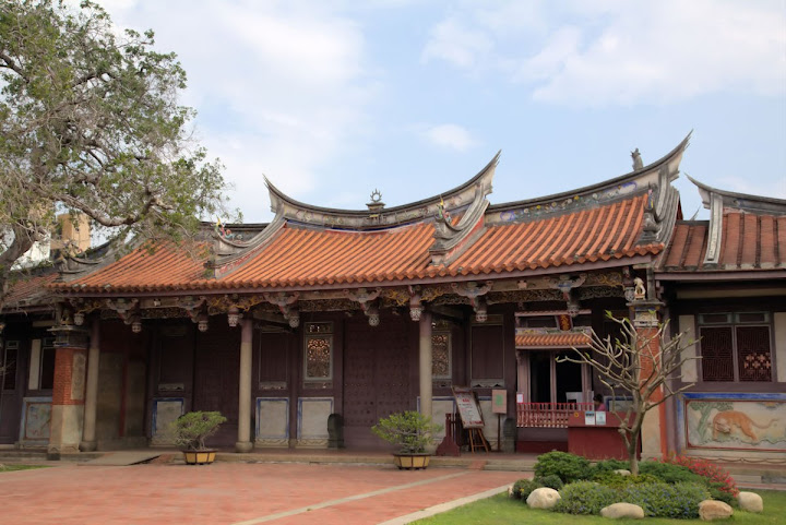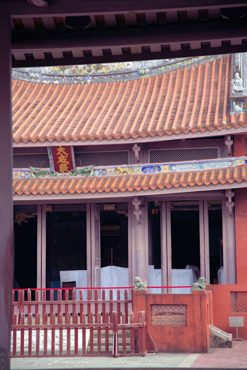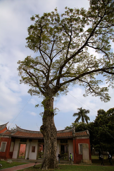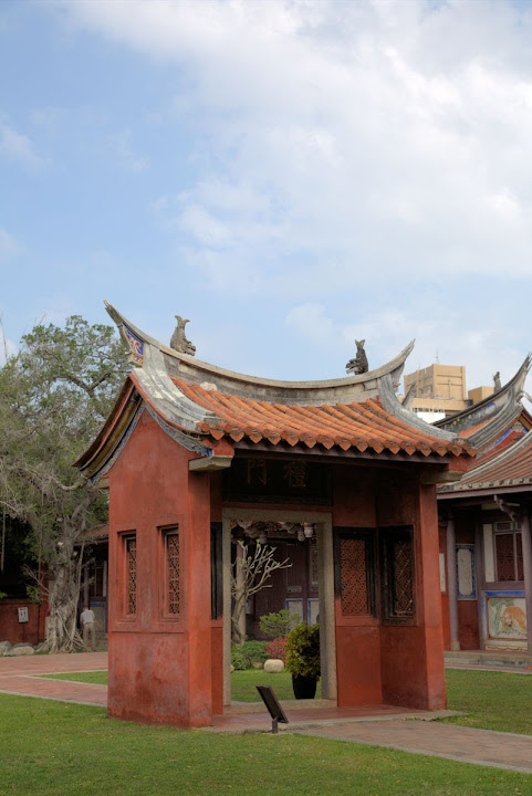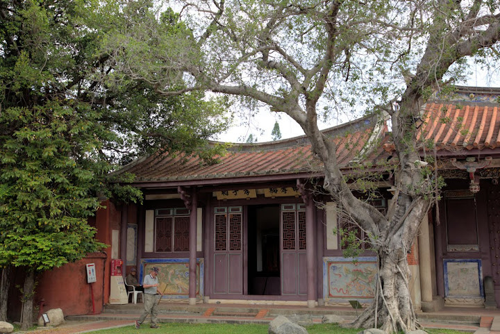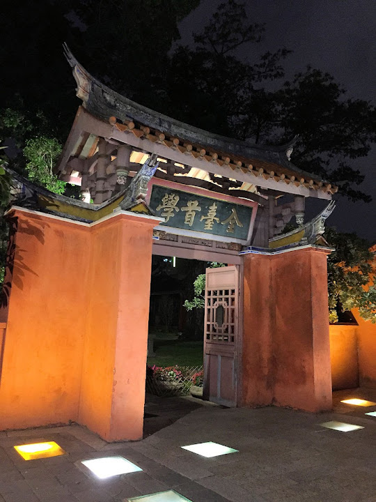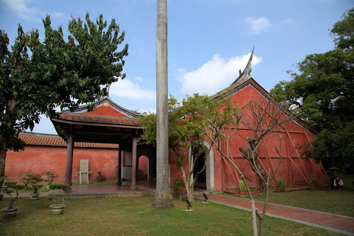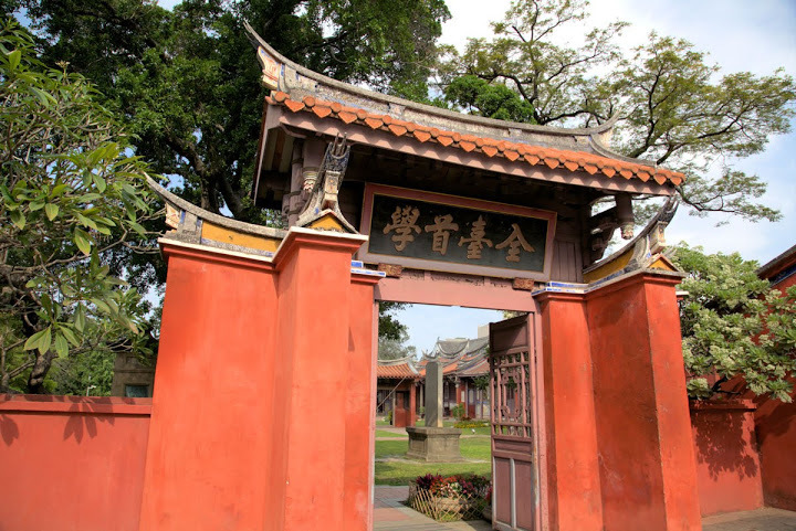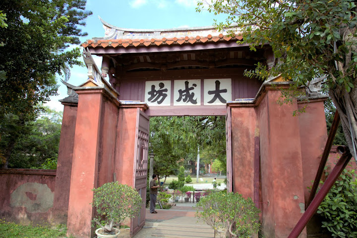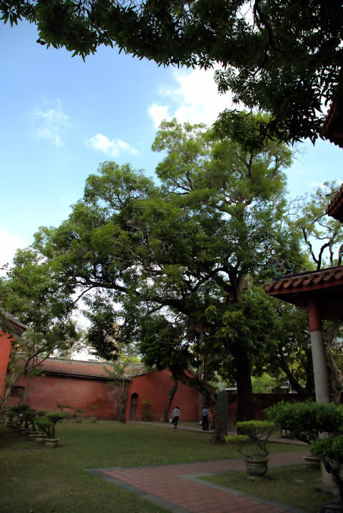 孔廟於1665年(明永曆十九年,清康熙四年),由陳永華提議興建。初時僅有大成殿,用以祭祠孔子,後來再設明倫堂供講學,是為全臺首學。歷明、清、日本、民國時期,各代均有翻修,於1983年列為一級古蹟。1997年文建會委託成大建築系規畫以孔廟為中心的文化園區,包含孔廟周圍若干史蹟景點。這日剛好在附近打尖,入住前摸黑夜遊,天亮後再連同旁邊忠義國小繞上一圈,因此有晝夜不同景致。