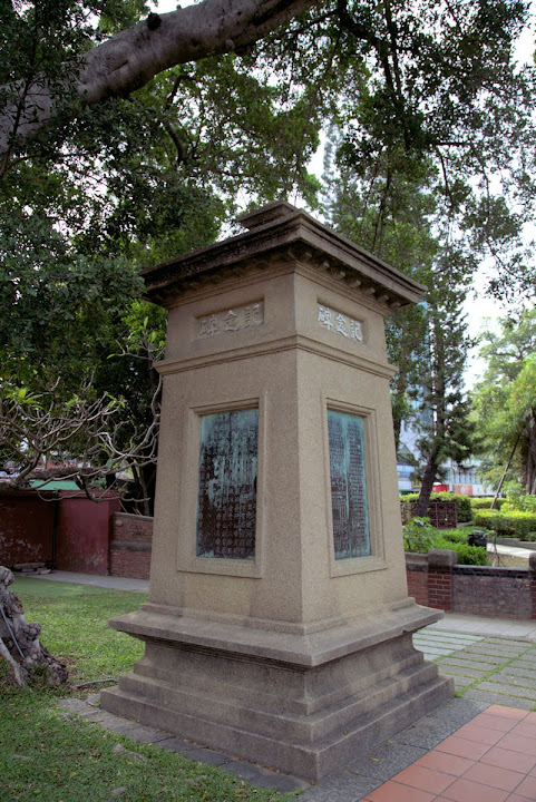 右:大正七年(1918)紀念碑亭,四面鐫刻「台南孔子廟重修碑記」等四塊銅牌