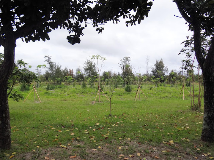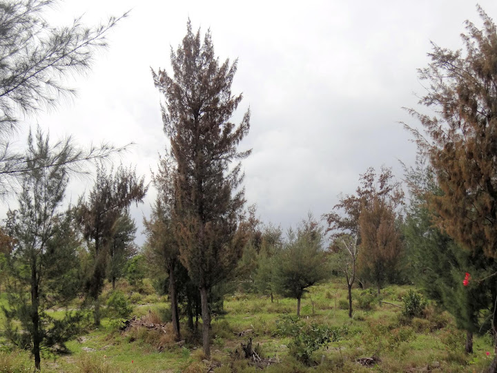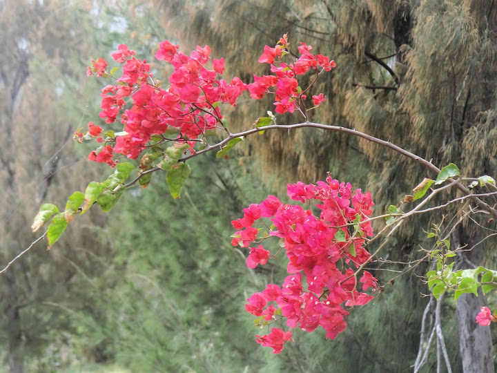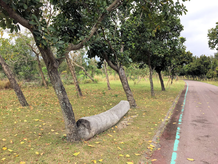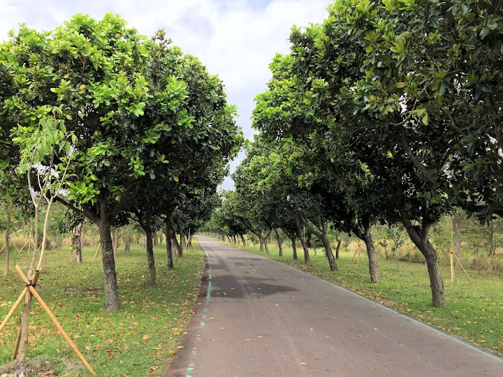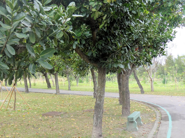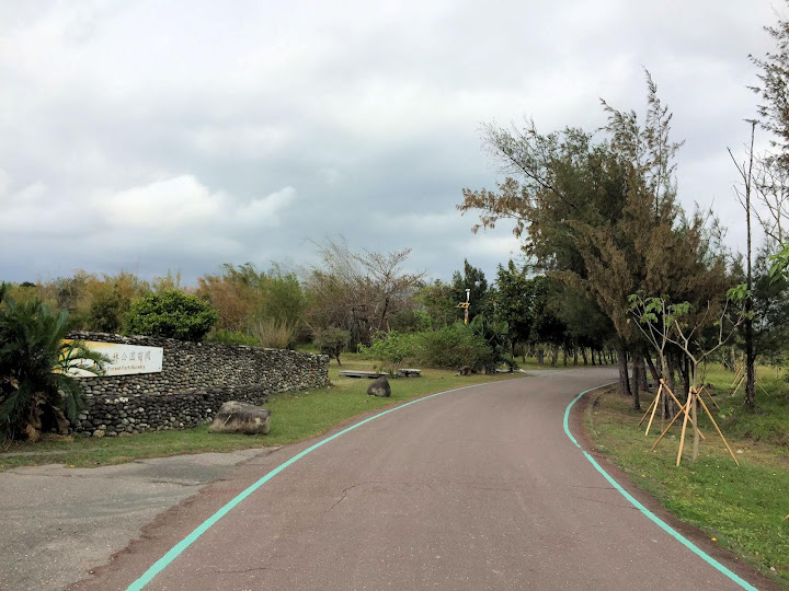 據說園內林種以木麻黃為主,目的是防風。注意道路邊線是綠色,那是山海鐵馬道的標誌,沿著綠線走,便不會迷路。往南另有一段稱為木麻黃大道,設施較多,步道交錯,若趕時間或怕迷路,沿綠線走是保險做法。