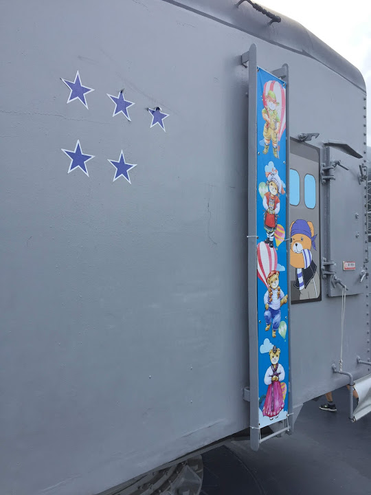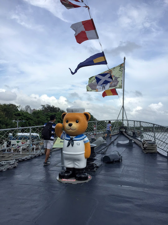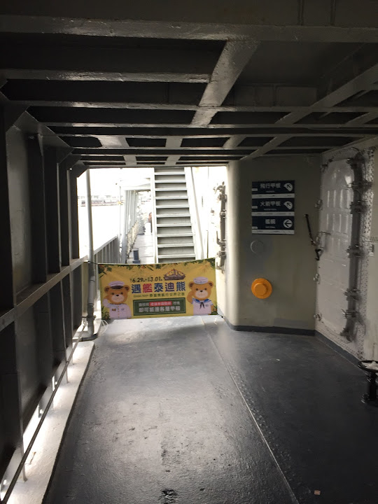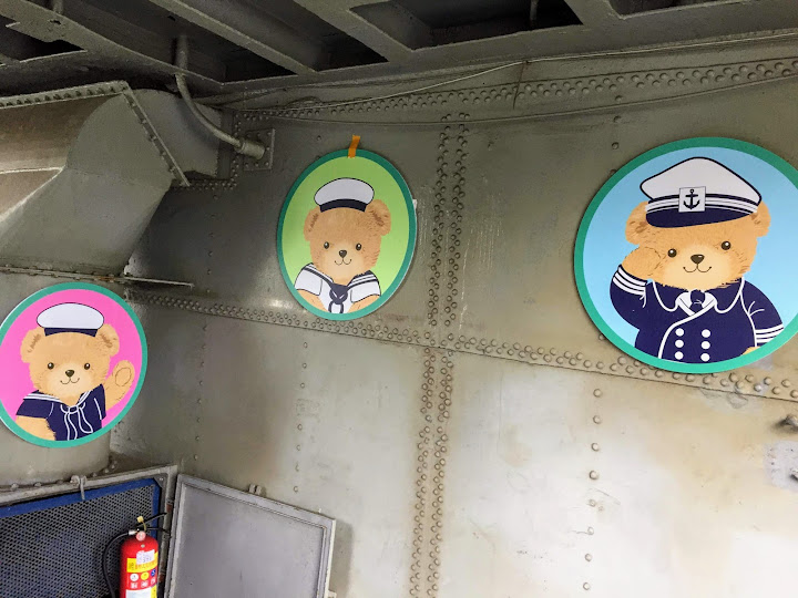沒想到的是,在陽剛軍艦上遇見泰迪熊哩,順便還抬高了票價。雖說反差甚大,但吸引一些原本對軍事設施興趣不高的人,或許也不枉稱為「定情碼頭」了。德陽艦相關資料見維基百科。這條船四十餘年前來台,沒打過仗,故事不多;美軍時代請自行參閱英文維基,就不抄書了。