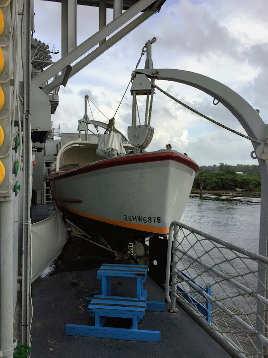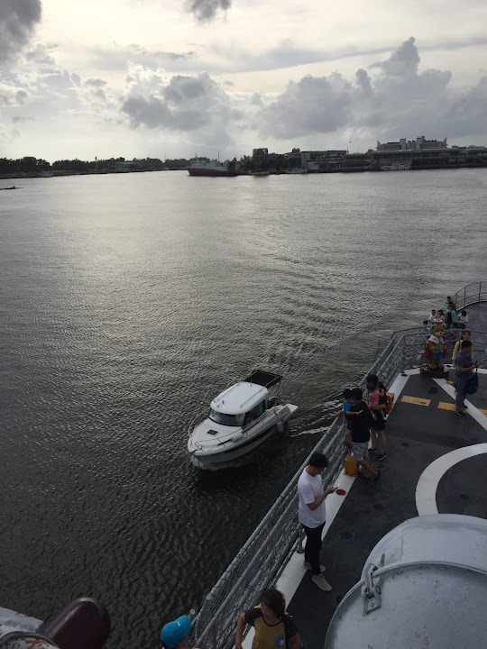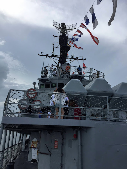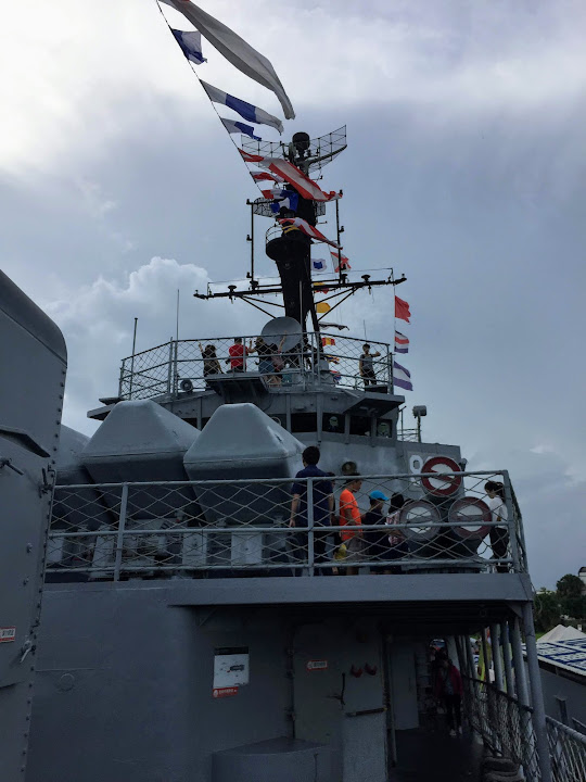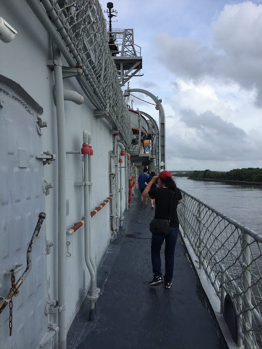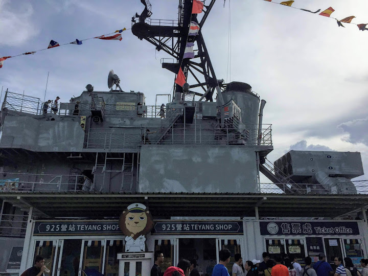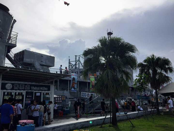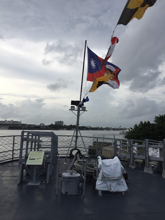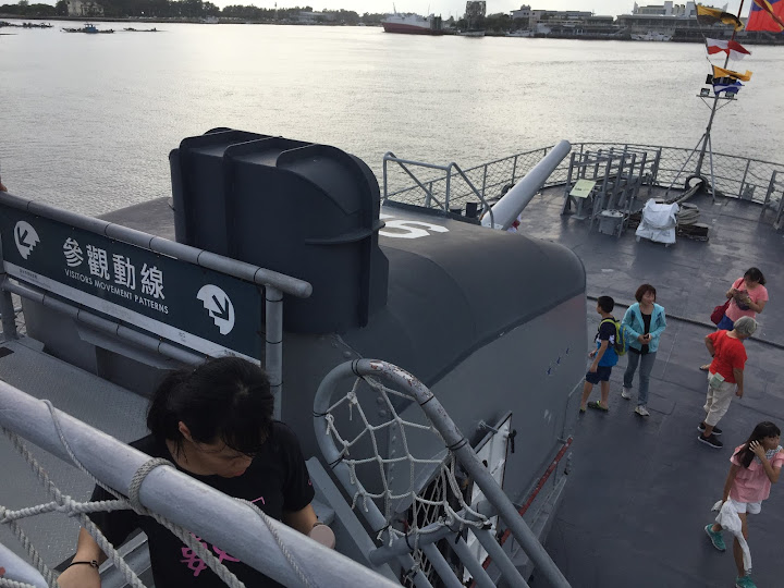 因預定住宿的成大會館「快閃價/不含早優惠專案」限晚上七點之後入住,天黑以前這段時間,需要找個地方打發。台南古蹟甚多,然而對我家兩隻小的沒啥吸引力,上網搜尋不是古蹟的景點,於是找出這條船來。雖說 George 前兩年在加州看過航空母艦「中途島號」,但台灣的軍艦,倒是無緣識荊(好啦,我知道她原本是美國船,就假裝愛台灣一下嘛),便興沖沖移師安平。