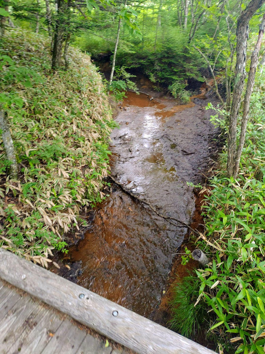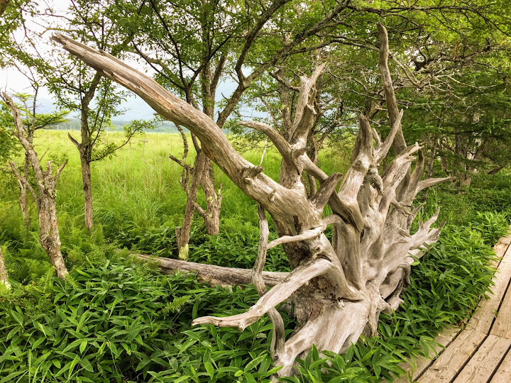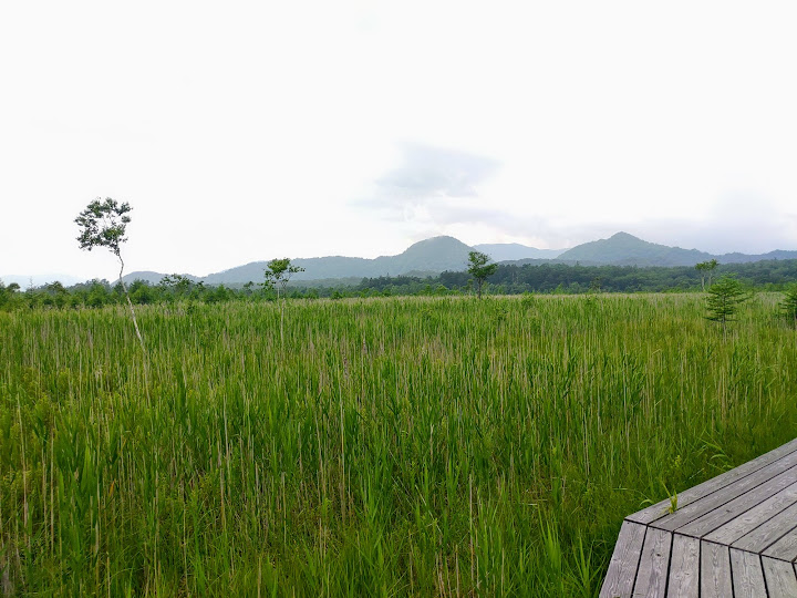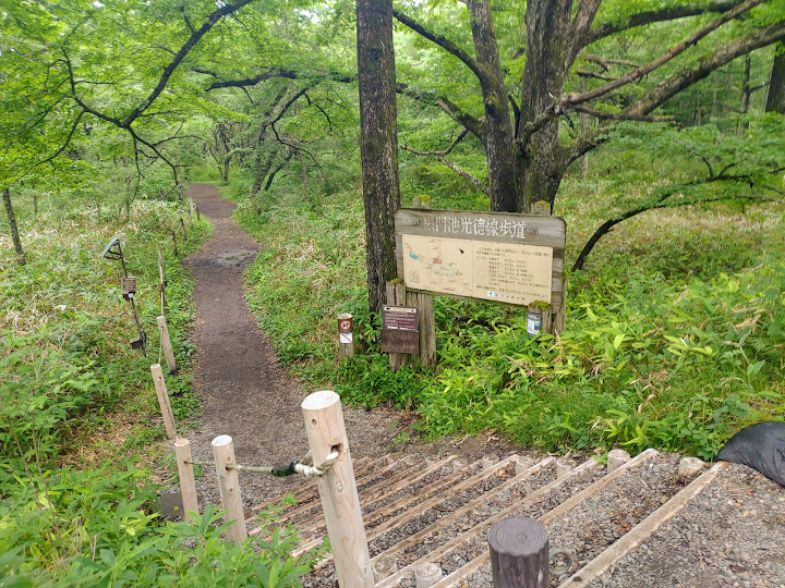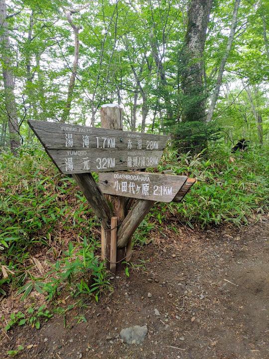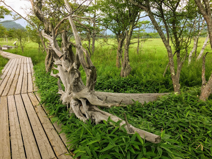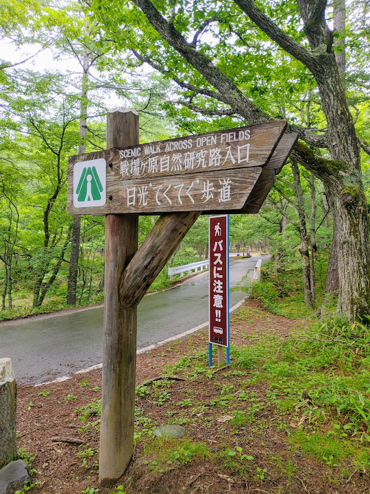 地名源自上古時代,諸神爭奪這塊寶地,最後由二荒神勝出,雄據男體山,一統江湖唯我獨尊。這塊四百公頃溼地,大約就成了他家後院啦。海拔高約1390~1400米,地勢平坦,相當好走。自然研究路則是沿著貫穿戰場原的湯川而開闢的步道,經過溼原的部份大都鋪有木棧道,赤沼以南林地則多為泥土路,適逢午後大雨,頗為泥濘。