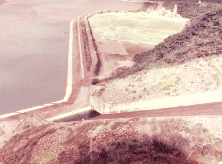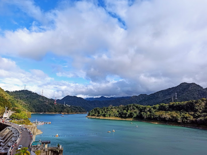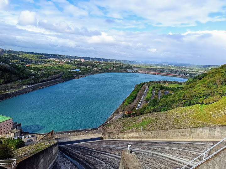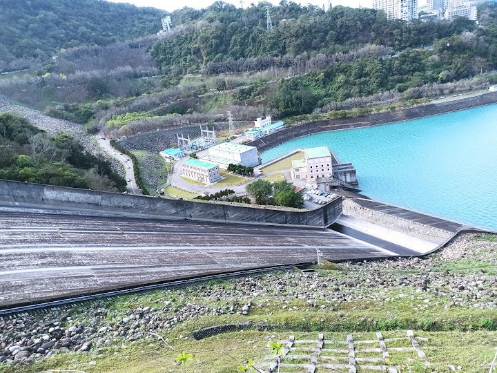 說起來與大壩頂睽違更久,是我國中時代,超過四十年啦!當其時也,現在停車的壩底稱為南苑的地方,好像有個叫做亞洲樂園的遊樂場,不知什麼時候沒了。這會兒只有公園、停車場。篇首圖中下方便是公園,水域則是位於大壩下方的「後池」,用以調節發電尾水、溢洪道與排洪隧道洪水。右方紅色橋樑是台4線經過的溪洲大橋,其前方有後池堰,堰上則有後池大橋,乃是行人橋。
