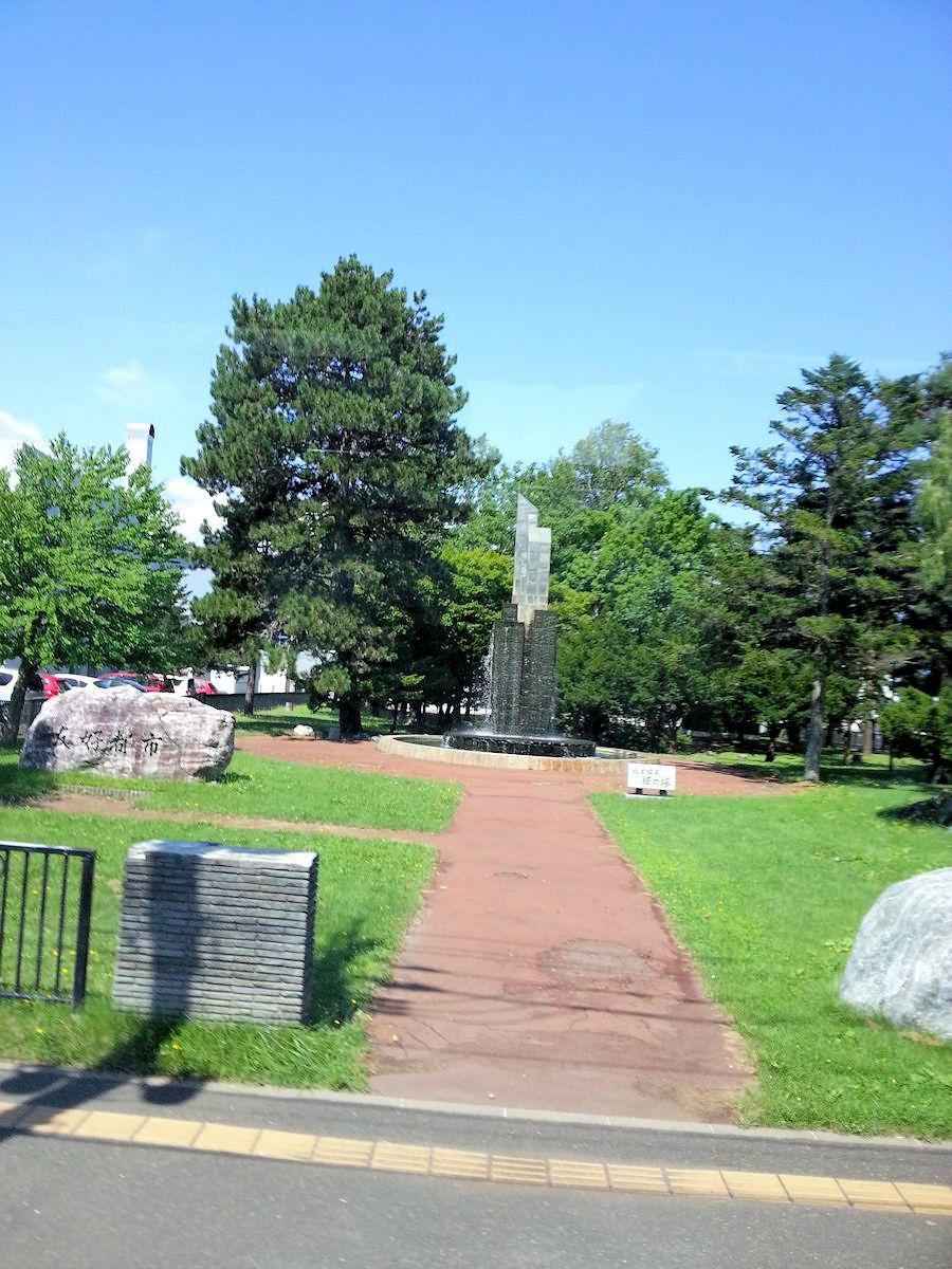 桂木綠地公園在富良野市區,中央噴水池據說用的是地下水,池中石碑曰「人、水、綠之塔(人と水と緑の塔)」,找不到進一步說明,姑記之。