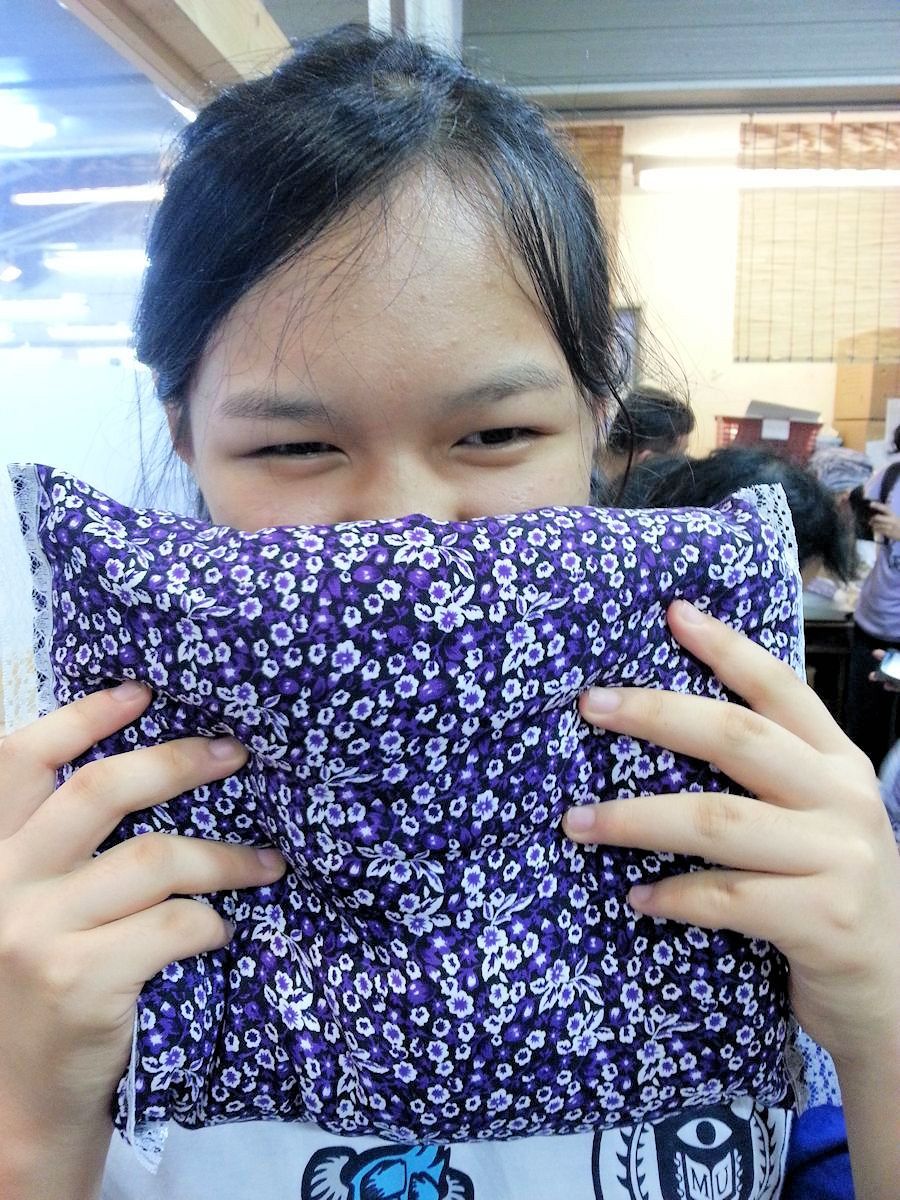 行程表當中有個節目,叫薰衣草枕頭DIY。LKK本來沒興趣,已經走到門外吹風,無奈小妮子想玩,又擠過層層疊疊的人群走進教室。結果這個DIY忒煞簡單,一坨棉花灑上薰衣草籽,折起來包進紫色布套,拍一拍就完工了。從門外擠進來,花的時間都比較久。