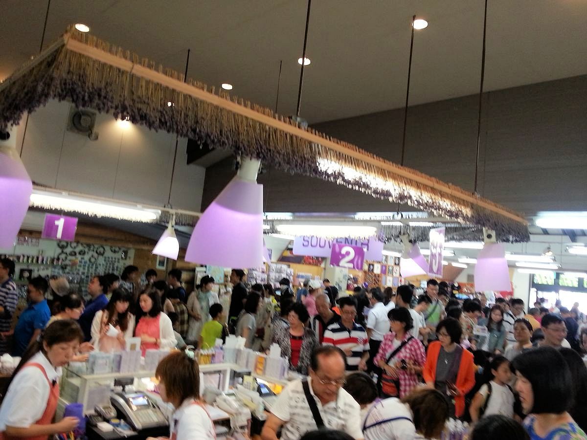 緊接著到不遠的薰之丘(Herb Hill Furano,亦云香草丘)海盜餐廳(Viking Restaurant)享用哈密瓜吃到飽的包肥大餐。老實說,時間剛過十一點,早餐還沒消化,很多人又在起司工房饞嘴進補,根本吃不下。但導遊說,若不佔機先,待會兒大隊陸客蜂擁而至,就很難搶食,恐怕連位子都沒有。果不其然,我們還沒下桌,門裡門外已經水洩不通,連紀念品店都人山人海。