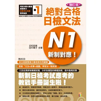 配合新制日檢,史上最強的日檢N1文法集《增訂版 新制對應 絕對合格!日檢文法N1》,是根據日本國際交流基金會(JAPAN FOUNDATION)之前的基準及新發表的新日本語能力試驗相關概要,加以編寫彙整而成的。