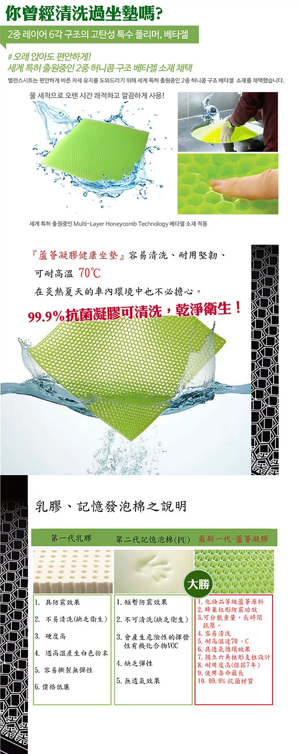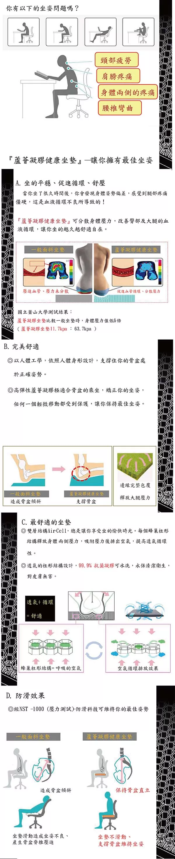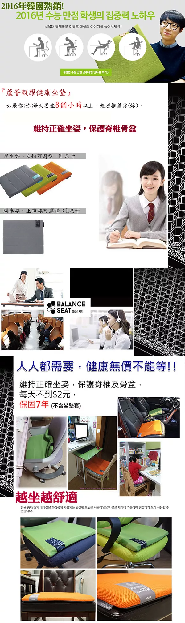 ●為每天坐8個小時以上的人所設計,車主、上班族、學生都需要『蘆薈凝膠健康坐墊』,越坐越舒適。