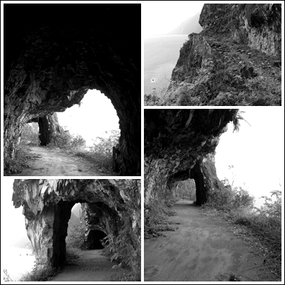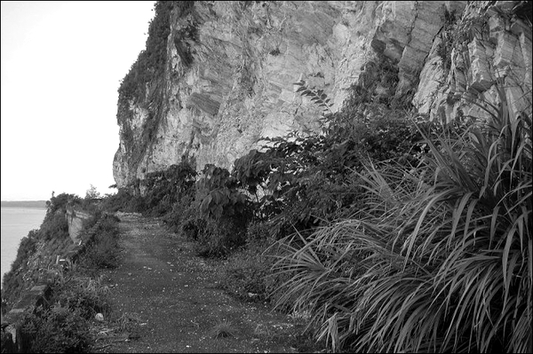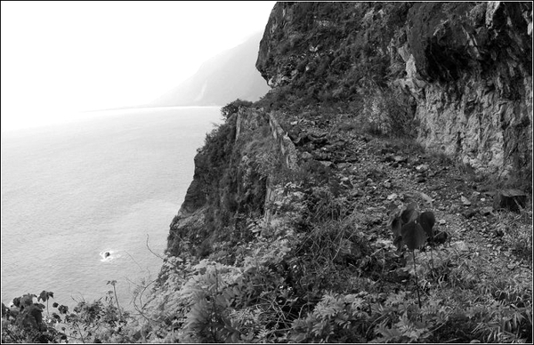 危崖壁立,緊臨太平洋,狹窄的山路古道遺址,當年的滄桑是台灣公路建設的縮影。(網上翻拍的照片,經過了黑白處理)。