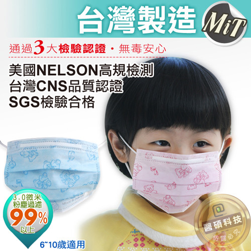 商品名稱:台灣製 6-10歲兒童平面三層式不織布口罩 5入/包(藍熊/粉熊/綠熊)
