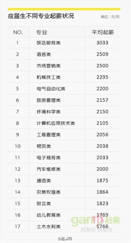 實用類與技術類專業起薪明顯高於其他專業,這兩大類專業的應屆生就業相對容易。趕集網數據顯示,飯店服務類排名第一,起薪平均為3033元/月,其次為語言類專業2509元/月,市場營銷類2500元/月,機械技工類2295元/月,電氣自動化類2200元/月,旅遊管理類2157元/月。