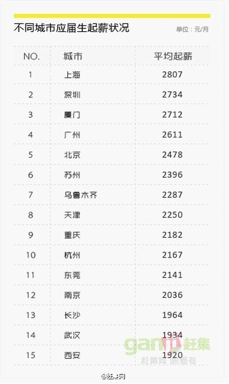 上海起薪最高深圳第二 南京起薪2036元
