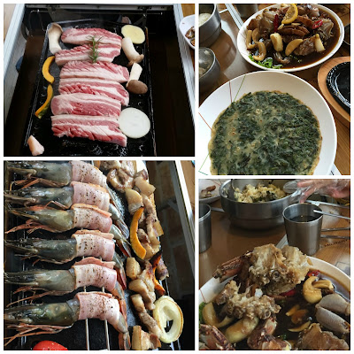 第二天主打黑豚肉+醃蟹,再配以煙肉蝦、煎餅、韓式前菜等等。黑豚肉和蝦經韓式燒烤後進食,肉質鮮甜,螃蟹未經烹煮,以醋醃起來,導遊教我們將生蟹肉擠出來用來撈飯吃。這樣吃蟹還是第一次,新鮮是肯定的,但這樣其實沒吃到多少蟹味,可能是醋味太濃吧。