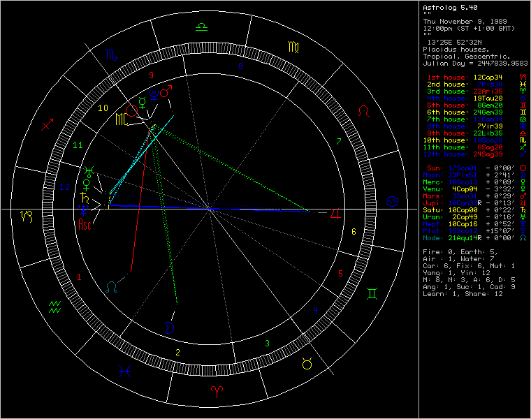 1989年11月9日(太陽水星與冥王星合相/土星海王星合相),新東德政府開始計劃放鬆對東德人民的旅遊限制,但由於當時東德的中央政治局委員君特·沙博夫斯基(Günter Schabowski)對上級命令的誤解,錯誤地宣佈柏林圍牆即將開放,導致數以萬計的市民走上街頭,拆毀圍牆。此事件也成爲「柏林圍牆倒塌」,雖然圍牆不是自己結構倒塌,而是爾後被拆除。柏林圍牆的倒塌被歷史學家認為是東西方冷戰終結的開始,也是東西柏林和東西德統一的標誌。1990年10月3日,德意志民主共和國(東德)加入德意志聯邦共和國,德國和柏林完成統一。