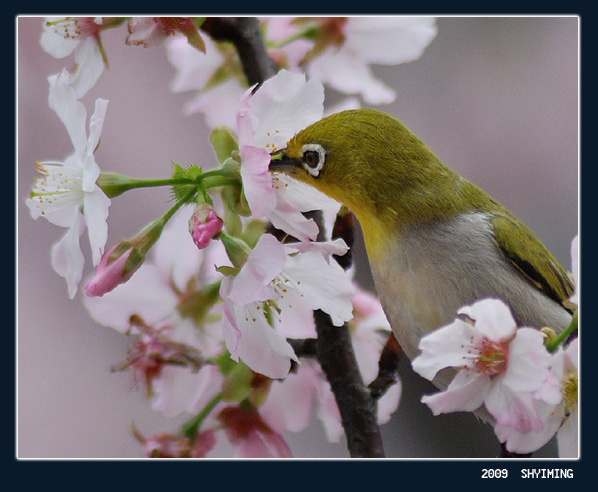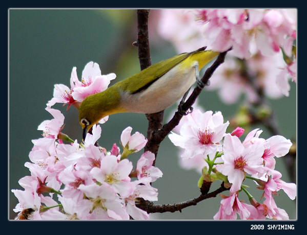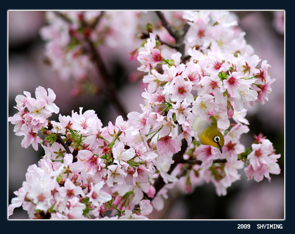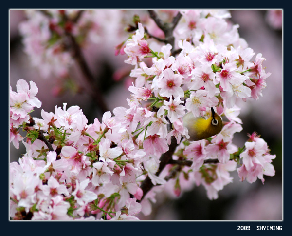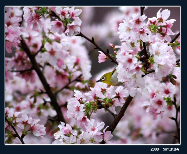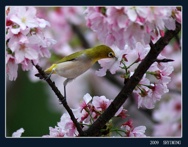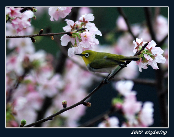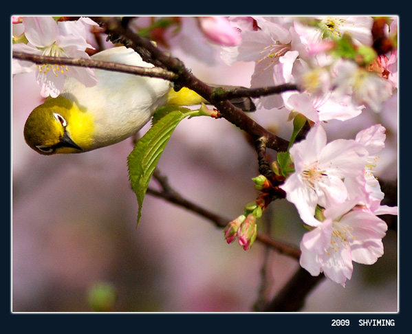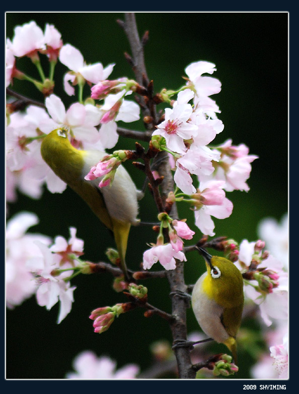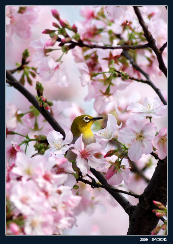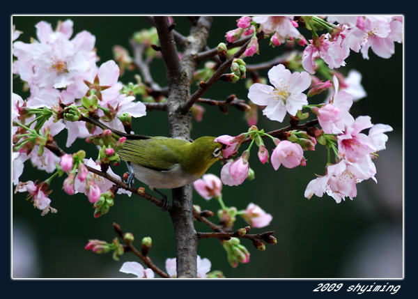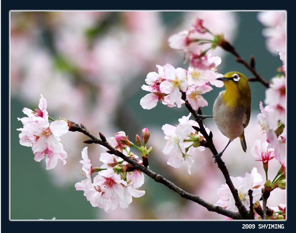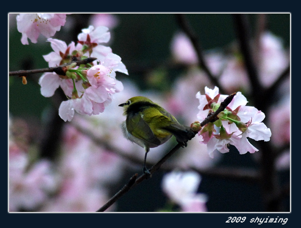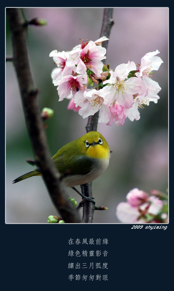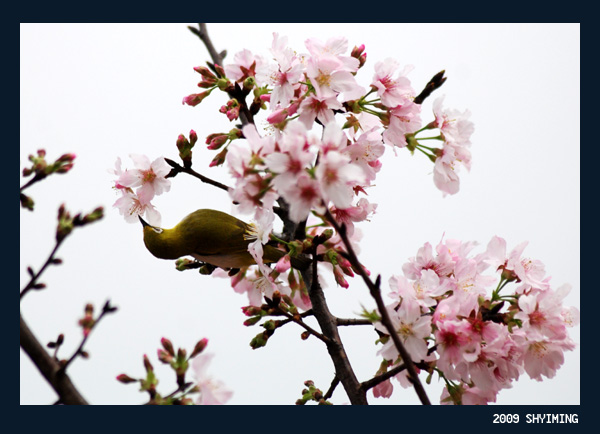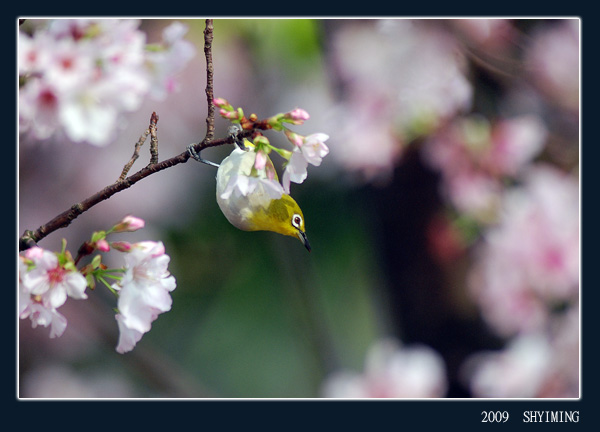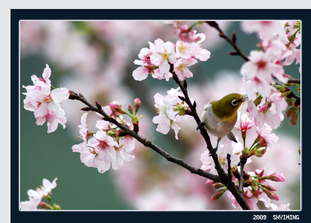 2009賞櫻花已是其次,看綠繡眼的美妙身影,則是讓人全新感受,春天就是這樣活潑。過動兒般的小小綠繡眼,當與它們對眼互視,我看到人與自然的和諧,沒有敵視;綠繡眼與櫻花的約會,我也在其中不期而遇。