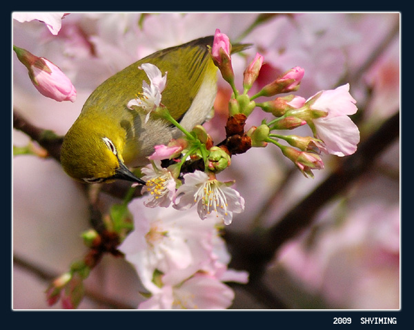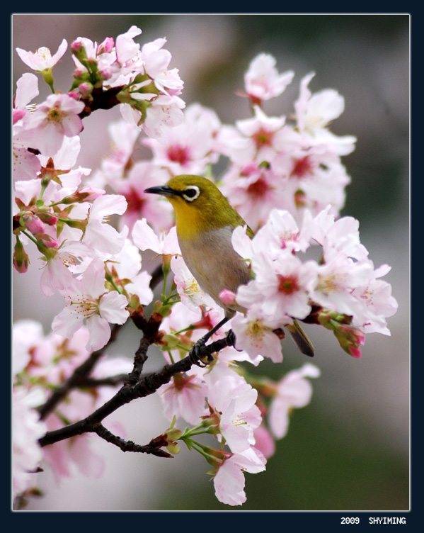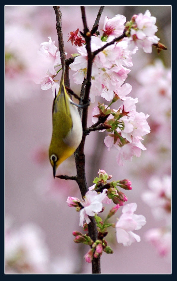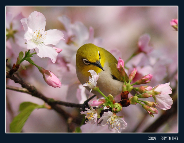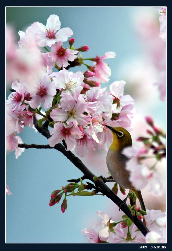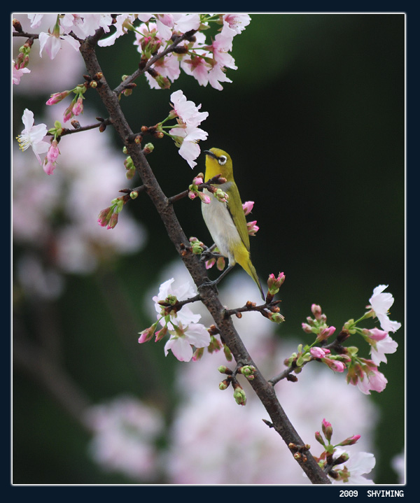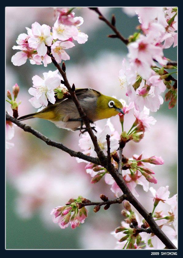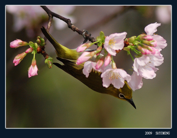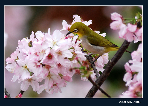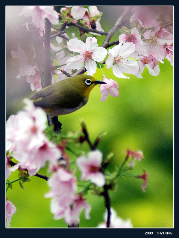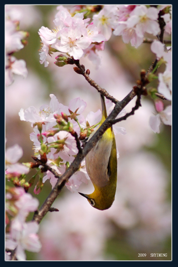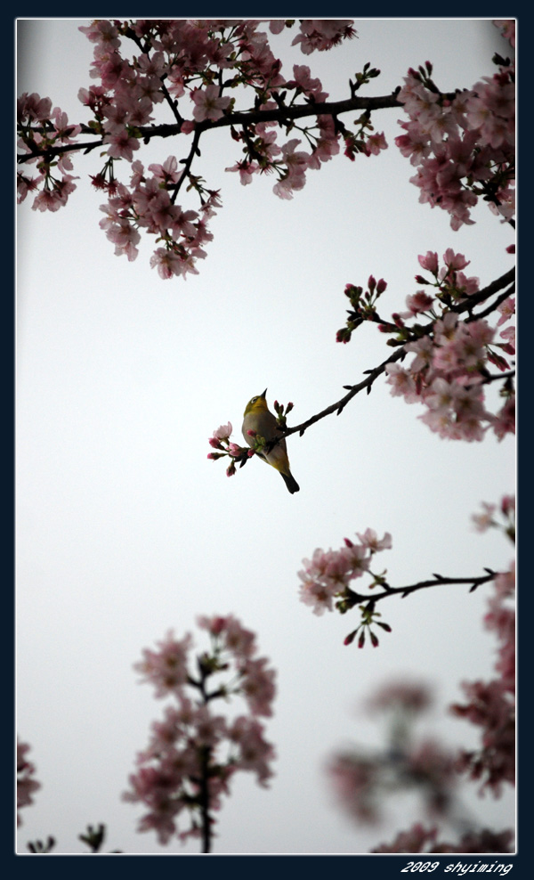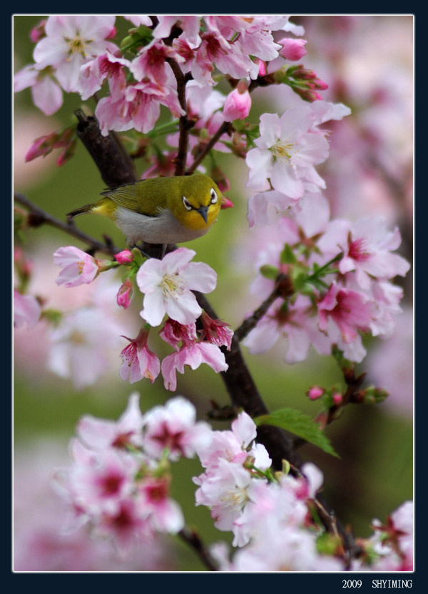 2009賞櫻花已是其次,看綠繡眼的美妙身影,則是讓人全新感受,春天就是這樣活潑。過動兒般的小小綠繡眼,當與它們對眼互視,我看到人與自然的和諧,沒有敵視;綠繡眼與櫻花的約會,我也在其中不期而遇。