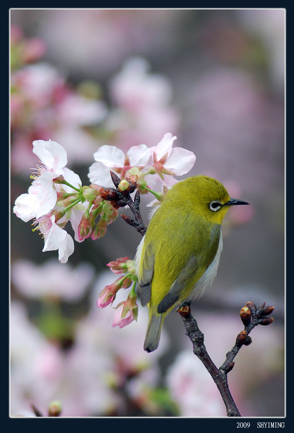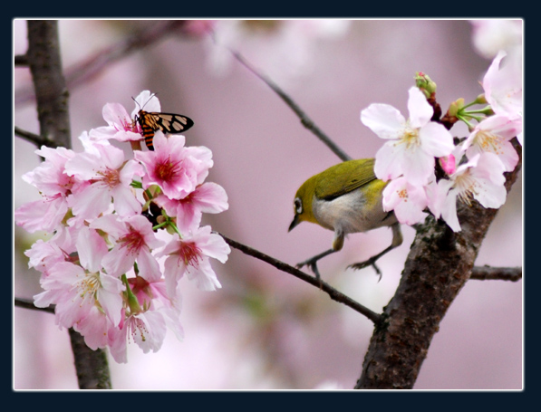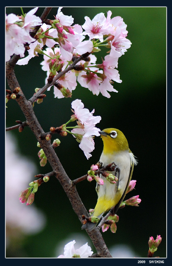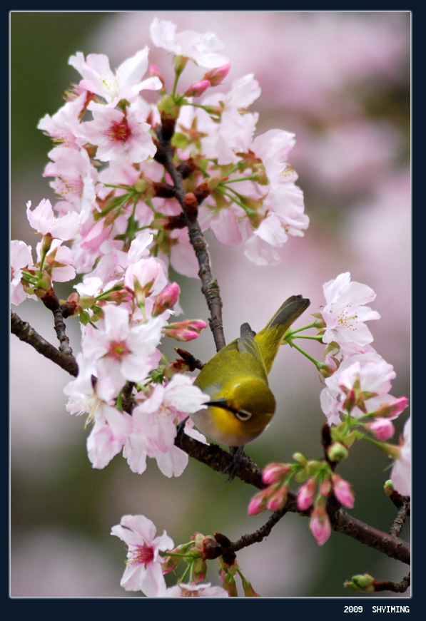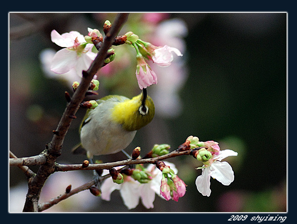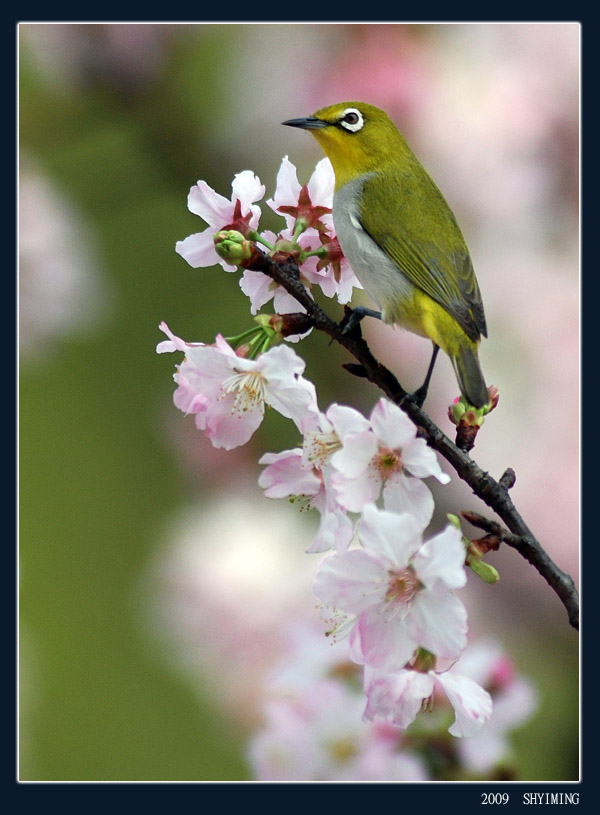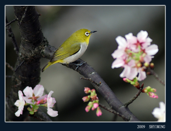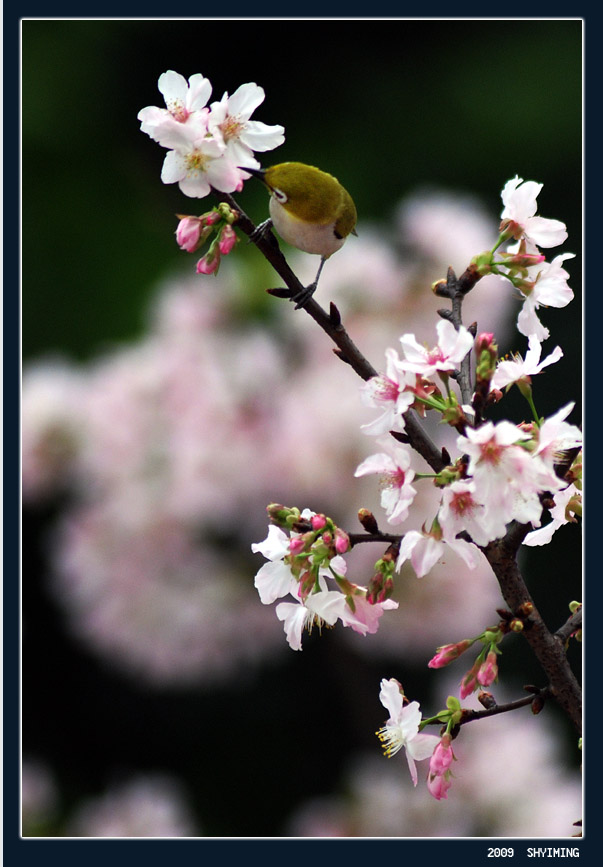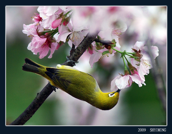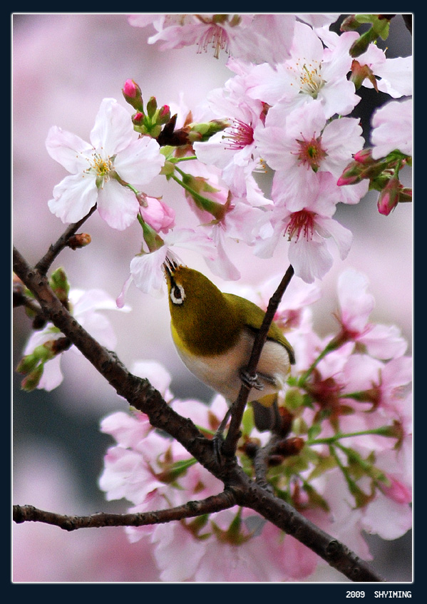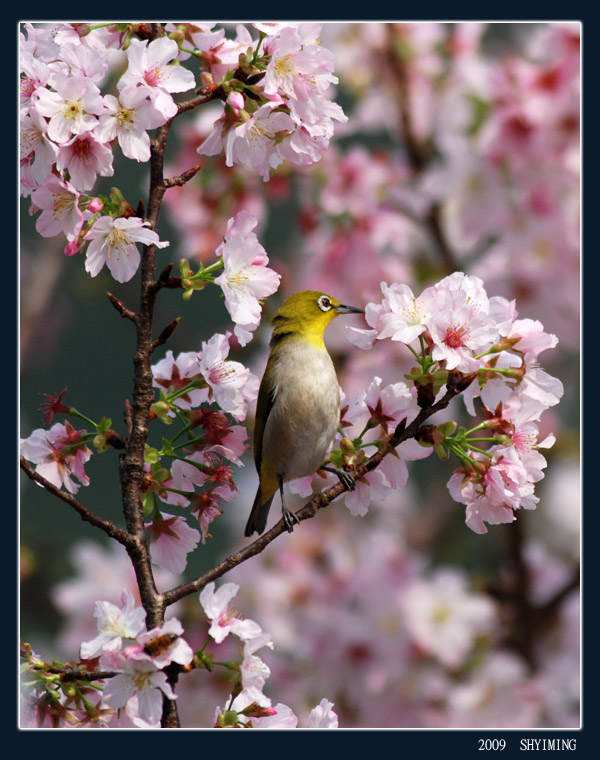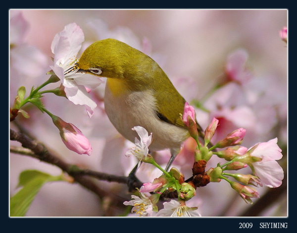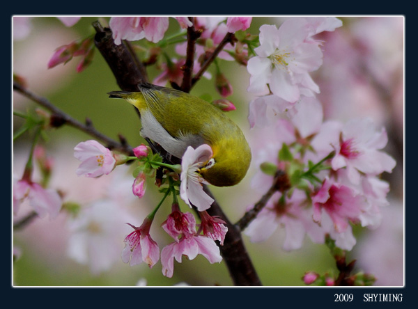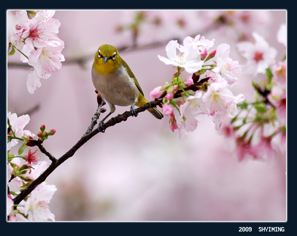2009賞櫻花已是其次,看綠繡眼的美妙身影,則是讓人全新感受,春天就是這樣活潑。過動兒般的小小綠繡眼,當與它們對眼互視,我看到人與自然的和諧,沒有敵視;綠繡眼與櫻花的約會,我也在其中不期而遇。