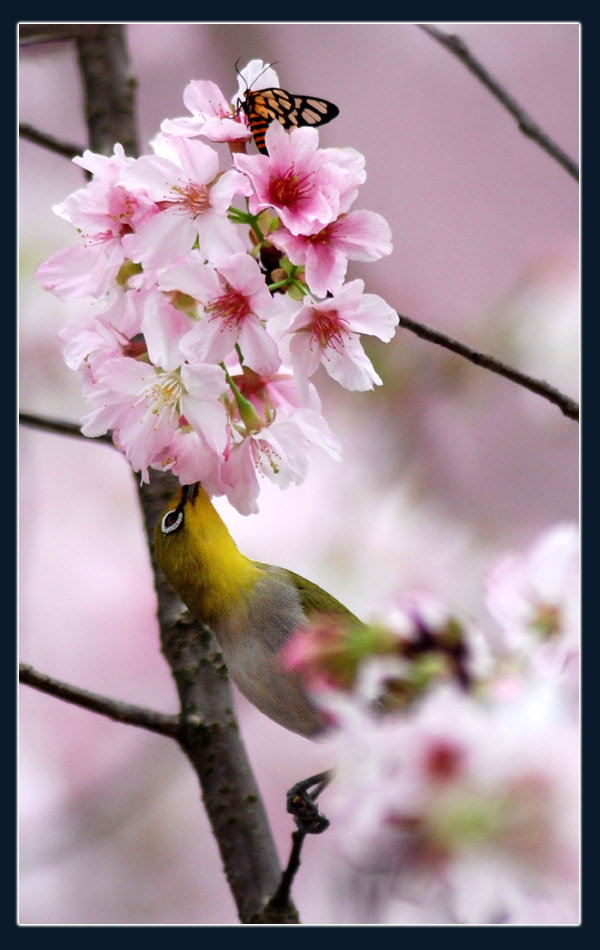 盛開的櫻花吸引蜂群,每朵盛綻的花房,幾成它們的地盤,羞澀易被驚嚇的綠繡眼,除了避開賞花人的驚擾,惱人的閃光燈與聲音,還得顧忌蜂群螫咬干擾,所以時時伺機而動,趁虛而入快打快跑就是它們的工夫,搶著與蜂蝶吸取春天最甜美的汁液。