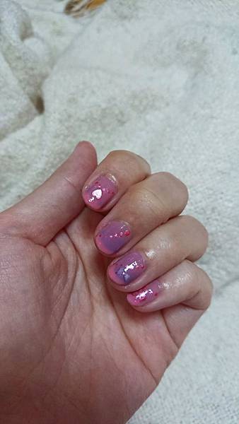 然後看到我的食指上有一片愛心,是編號034的粉色桃心,就是整罐愛心亮片啦,很好看,但是亮片根本無法附著在刷毛上沾取啊,