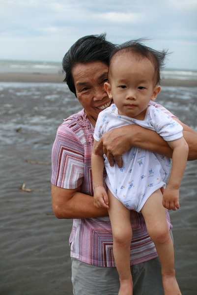 <<王奶奶帶著咕雞,迎著海風,享受著天倫之樂>>