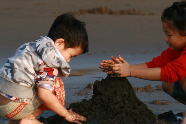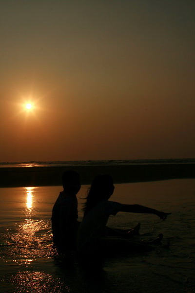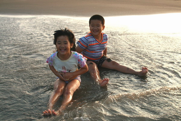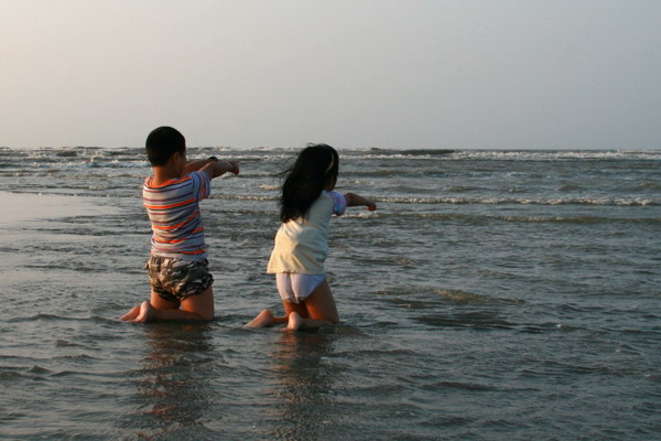 <<夕陽西斜,王小妹跟哥哥已經捨不得上岸了>>